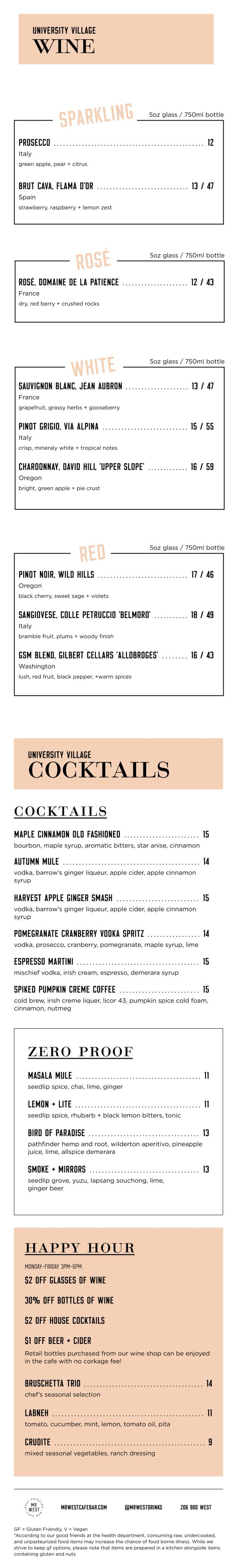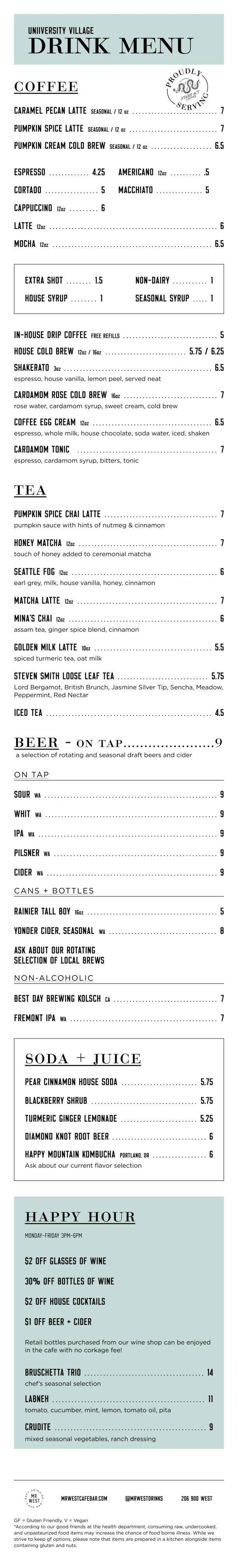 Sun-Thur :: 8am-8pmFri + Sat :: 8am-9pmHappy Hour :: Mon-Fri :: 3-6pm
